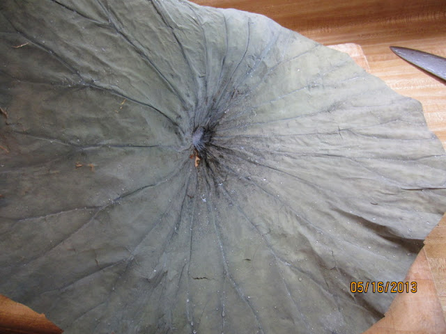 -Trên một cái thớt to và sạch cho lá sen đã được xử lý sạch sẻ lên thớt, trãi tỏ miếng ra, ngay ở điểm giữa của lá là cuốn lá, ace sẽ pleat (xếp mí / nếp...xem hình) ngay điểm giữa này, để tạo cho lá sen bằng phẵng để dễ dàng cho chuyện gói vào lá sen.